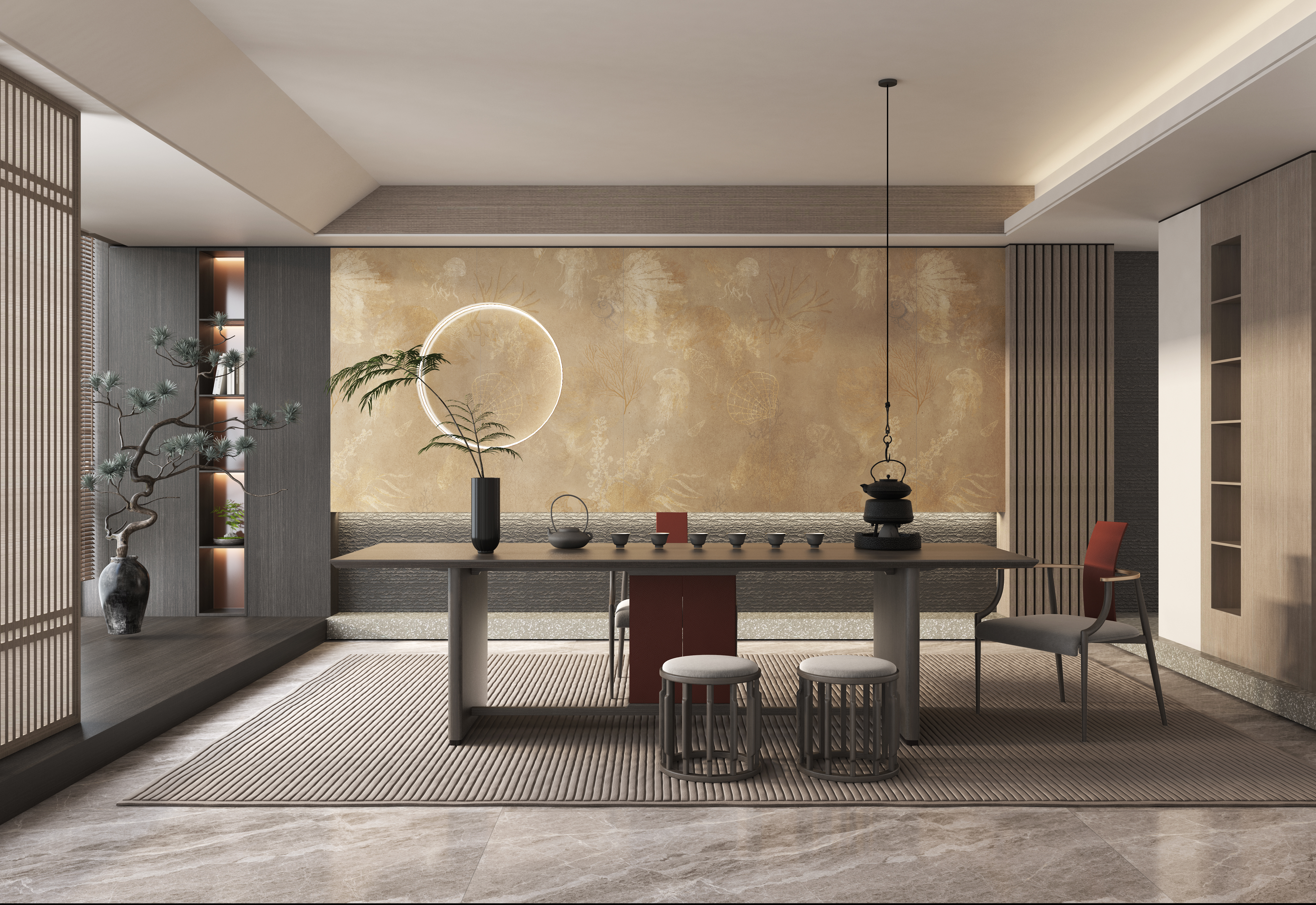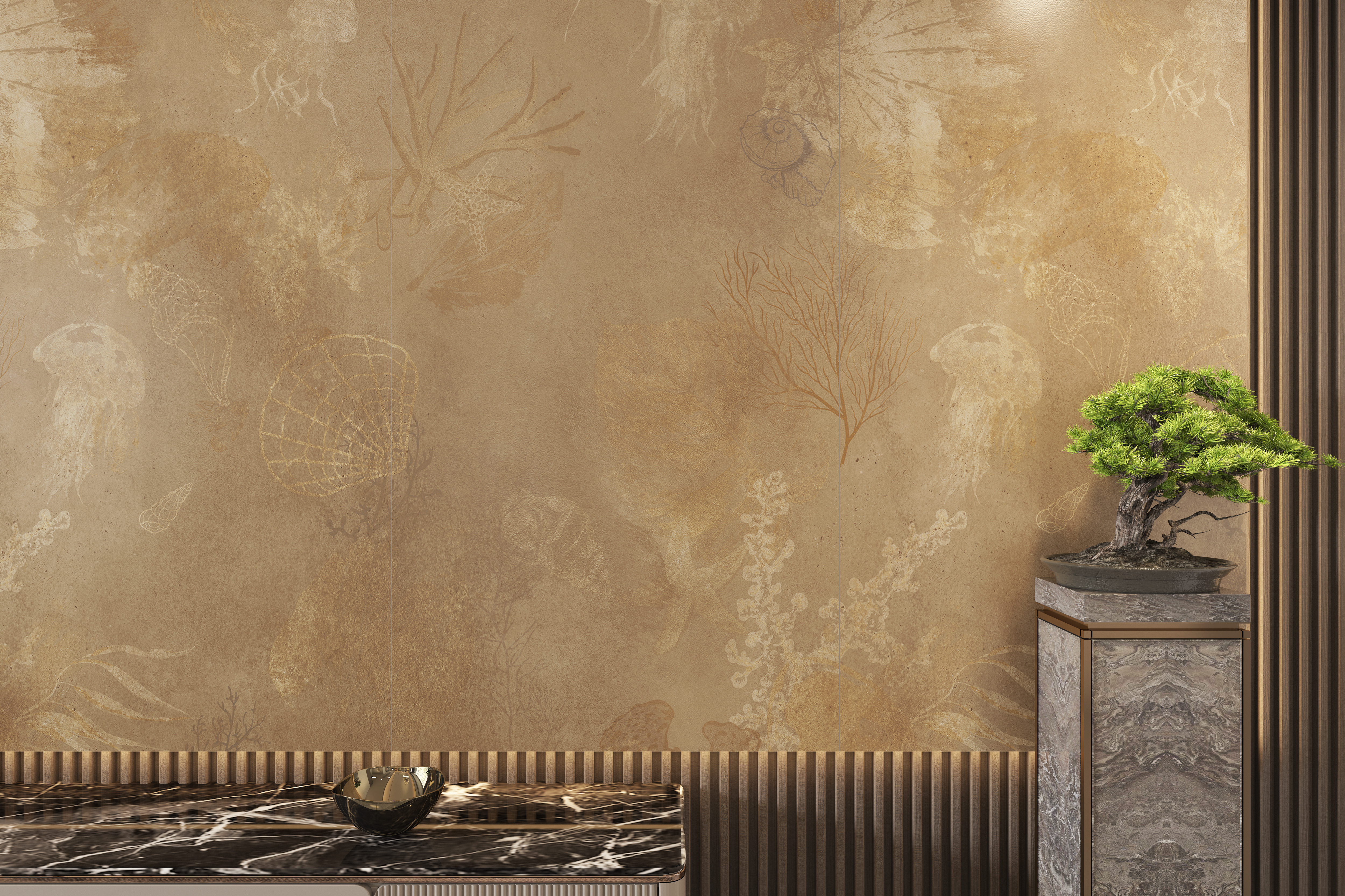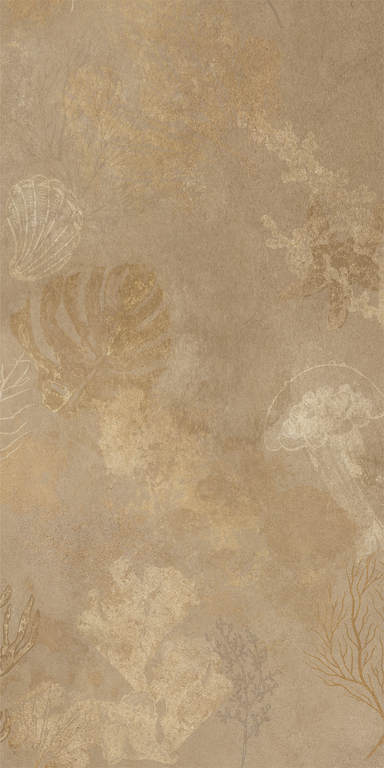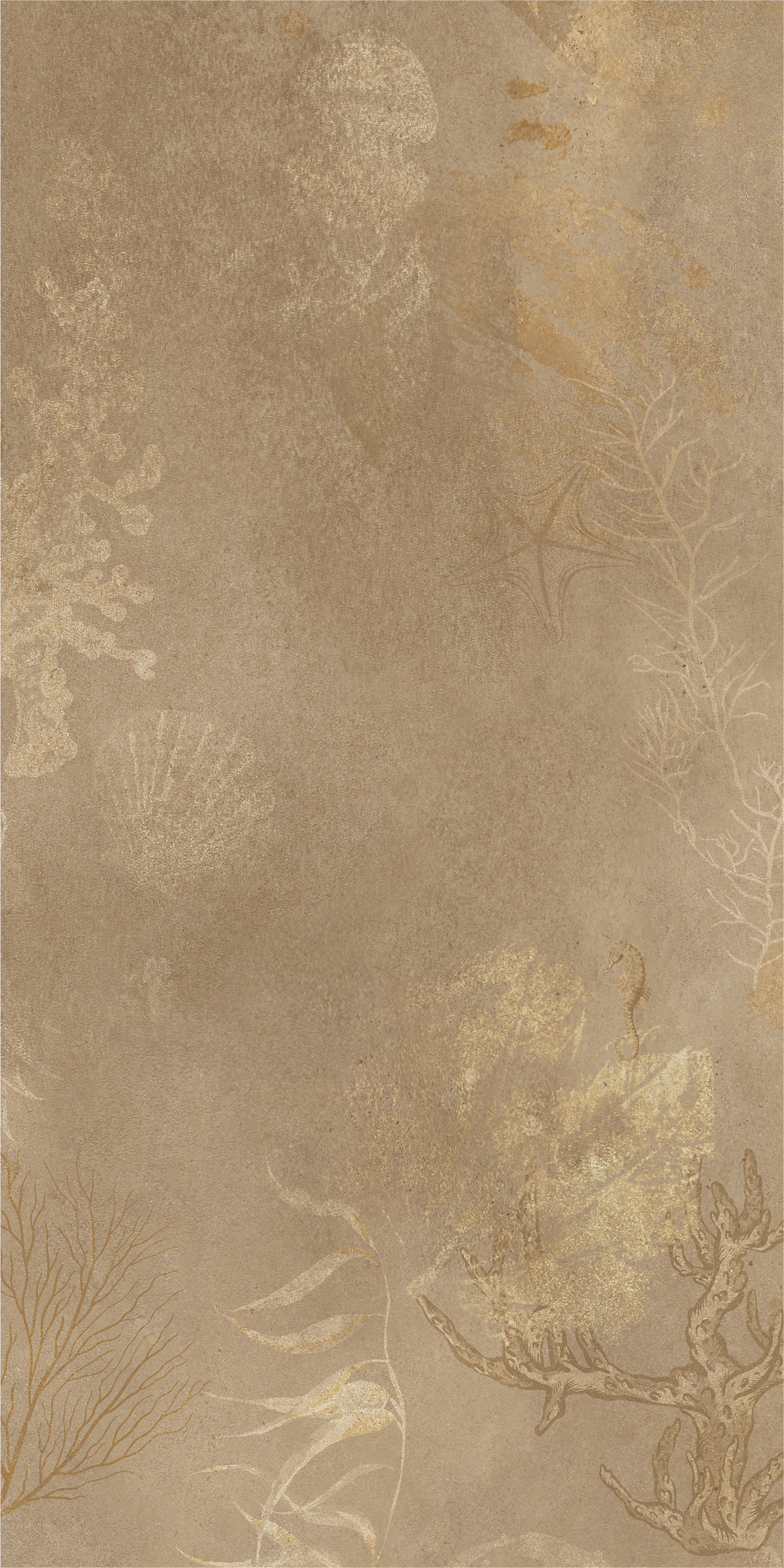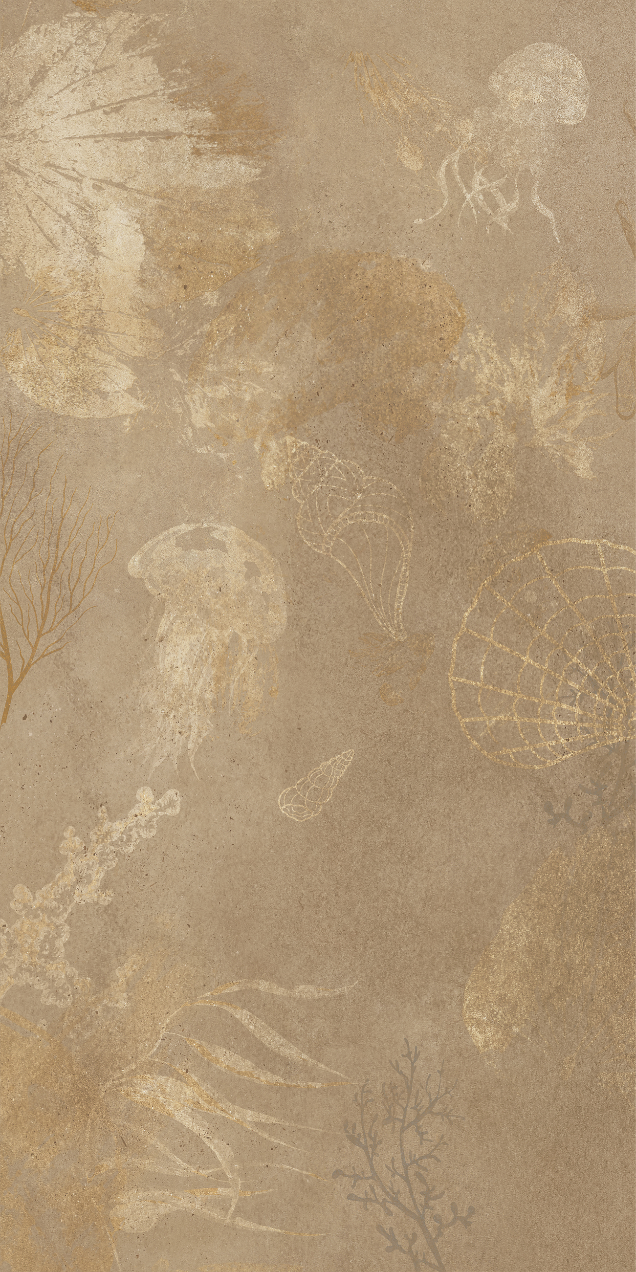 以棕黄色为主色调,恰似莫吉托中那抹淡淡的黄,温暖而不张扬,给人一种宁静而舒适的感觉。其表面纹理犹如被时光轻抚过的海底世界,隐约浮现的海洋生物和植物图案,带着一种朦胧的美感,仿佛在诉说着古老海洋的故事。